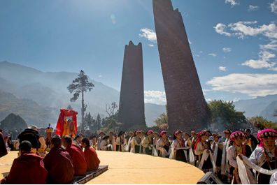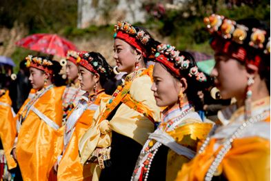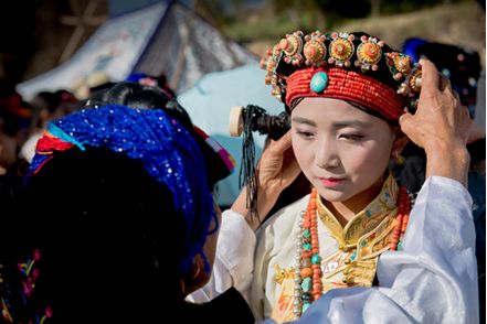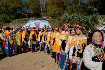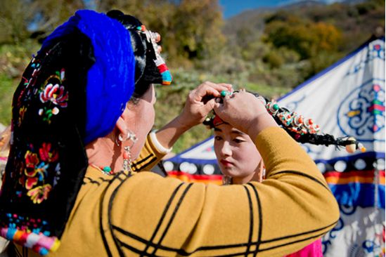 盘好发髻,佩戴好头饰,在肩、背系好五彩哈达后,由本村具有威望的女性长者引领来到仪式现场。法号声中,煨桑的青烟袅袅升起,威严的活佛主持诵经祈福仪式。随后,德高望重的长者为参加仪式的女子送祝福茶,长辈为姑娘们献哈达。一系列仪式结束后,无论男女老少,都来到场地中央,踏歌起舞,跳起吉祥的锅庄。