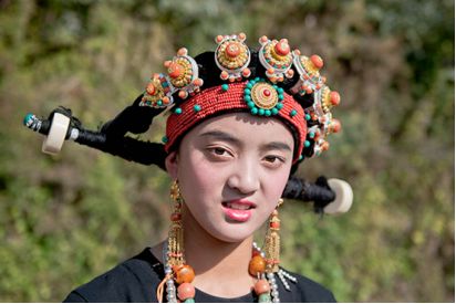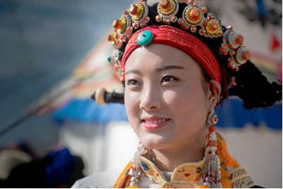 成人礼上,这些年满16岁的女孩子们打扮得体,明眸皓齿,一举一动都吸引着人们的目光,她们梳妆了代表成年的标志性发髻:头发在前额中分,左右各编3条小辫,其余头发再编数根俏丽的小辫,两边的发辫须对称地耷缠在一根长约50厘米,宽2厘米横着的发簪上,远看就象是一根扁担横在脑后际,这种发髻就叫“戴角角”。 头饰由额头至脑后,被一条粗发辫缠绕得紧紧的,上面排列着镶嵌有珊瑚、绿松石、九眼天珠等宝石的金银发箍。而额头则佩戴着用红丝线或红绒线织而成的扁平额饰,上面布满小珊瑚及珍珠等。