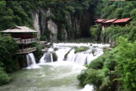 水洞下游有卧龙湖,水清可鉴,湖边排列着水车、水碾、水磨、“香粑车”等等往时乡间常见的农家物,给人以既古朴又清新的感觉。与卧龙湖相连的是一处罕见的钙化滩,足有200米长,滩面上瀑布流泻,水帘溶洞星罗棋布,植被茂密,堪称喀斯特景貌的一绝。这一带,春来桃花烂漫,夏临兰草吐芳,金秋野菊盛开,初冬火棘红艳,一年四季,风景如画。