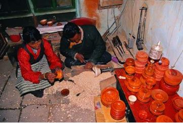 木碗的来源,一是西藏自己生产的,还有一种是云南迪庆生产的,都是从西藏的市场上交换或购买的。西藏林芝地区的朗县、察隅,山南地区的加查、隆子、错那,阿里地区的噶尔等地均产木碗。其中尤以错那生产的“察牙”木碗和噶尔生产的“堆旭”木碗最负盛名。以上木碗的原料选择树根或树瘤车制而成,选料之讲究,做工之精细,使好木碗的花纹各异,或磷火纹,或猪鬃纹,或猫头鹰眼纹,这些木碗都很名贵,与普通木碗之间的价格也很悬殊,一个上等木碗价值10头牦牛,一般人家是不敢问津的,但也尽量想方设法弄个像样的,以慰平生。