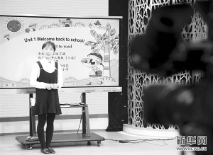 停课不停学,由宁夏回族自治区教育厅制作的“空中课堂”名师专递课程日前正式上线,学生可以在家中通过手机、电视、电脑等进行学习。图为银川市金凤区第一回民小学教师杨玉燕在录制“空中课堂”三年级英语课程。