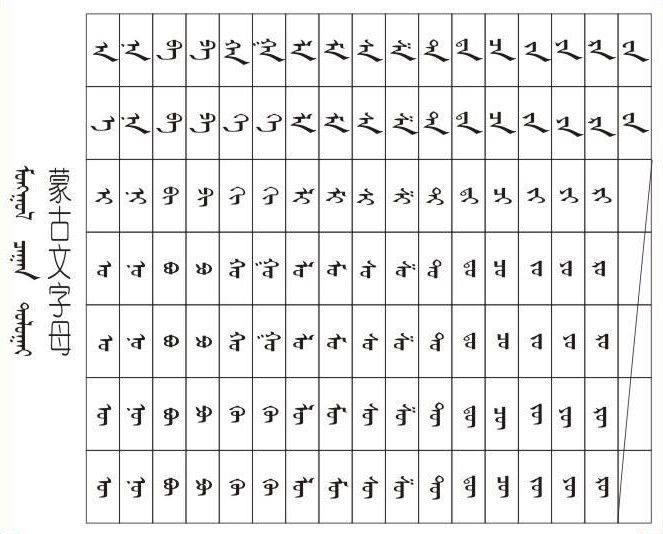回鹘式蒙古文字是一种拼音文字。字母分元音和辅音两大类,虽然至今人们尚未在文献记载中发现其字母表,但据后人对这种文字材料进行分析,归纳出有19个字母。其中,5个表示元音,14个表示辅音。书写时元音字母和辅音字母笔画连在一起,形成一个整体蒙古字。每个字母视其出现在词里的位置不同,写法略有变化,分词首、词中、词末3种变体。阿拼写时一般以词为单位,上下连书。字序从上到下,行序从左到右。因其是以回鹘文为基础创建的,因此称其为回鹘式蒙古文。
