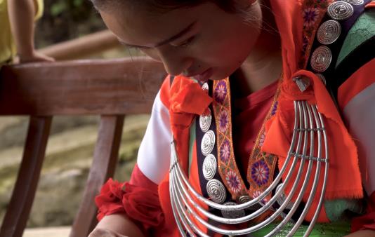 谷洒村苗族服饰上的图案,呈现多元化的风格,这是因为苗族女子的服饰往往都出自她们自己的手中,每件服饰都有着个人风格。谷洒村苗族喜欢在古井的凉亭上刺绣,这里凉风习习,是她们纳凉刺绣最好不过的地方。同伴坐在一起,这样以便于互相指点,学习对方的长处、弥补自己的短处。