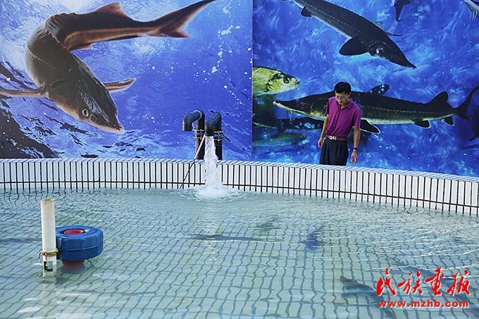 同江市赫哲族鱼展馆里养殖的鳇鱼,这些鳇鱼养大后会放归自然。