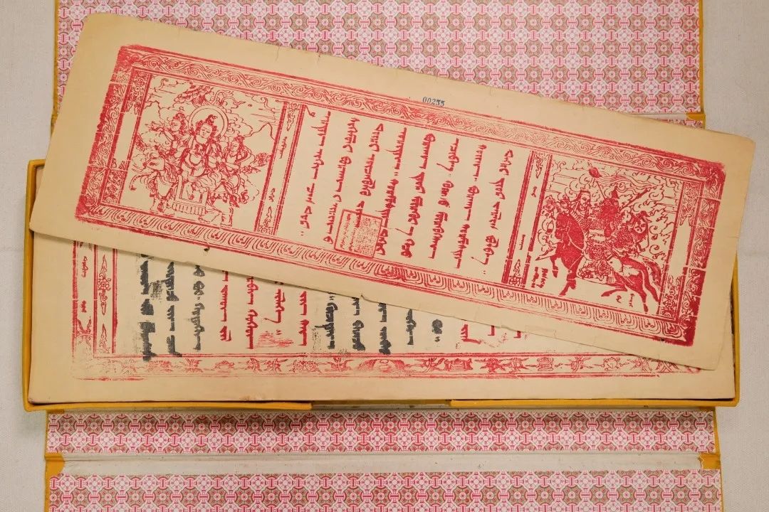 今天我们主要讲述的是1716年北京木刻本蒙古文《格斯尔传》(全称为《十方圣主格斯尔可汗传》)是清康熙五十五年(1716)北京木刻本。梵夹装,1卷(176叶),每页26行,每行6个字,约5万多字,页面高17.2cm、宽52cm,版框高13.5cm、宽46.5cm。版框左侧有汉文《三国志》三字,首页刻有朱印佛像。