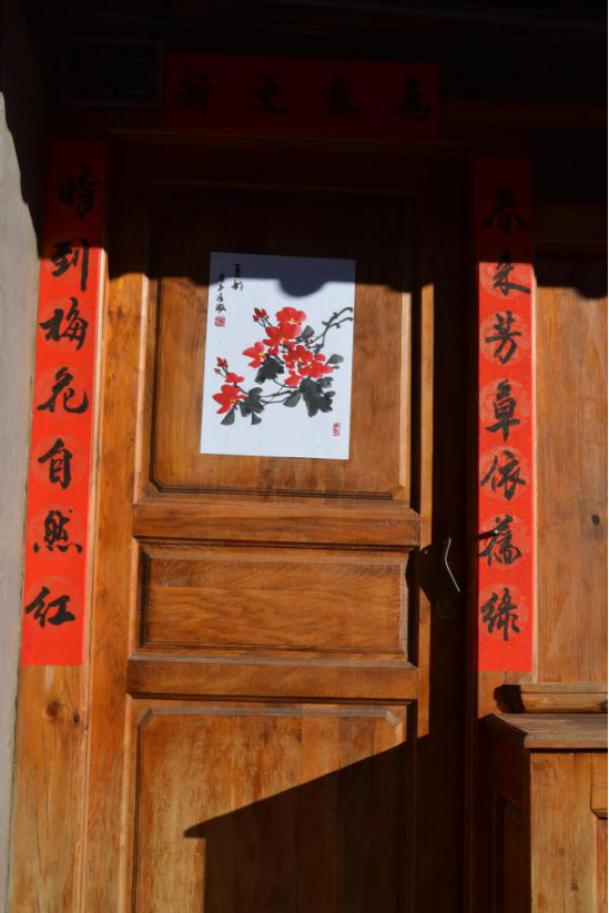 写春联绘年画的传统在剑川县金华镇由来已久,明朝洪武年间改土归流和移民屯边制度的推行,使儒家文化、理学思想逐渐融入边疆人民的生活。金华古镇居民受此影响,走上追求仕途功名的道路,文人乡绅都以显示儒学身份为荣。每逢春节,人们会邀请有功名的仕子或传学明经的文人来到家中,撰写对联,同时根据时令画上一两幅门神画,希望通过此举祈愿自家后生求得功名。如今走在金华古镇西门街上,仍能看到家家种花养草,户户楹联盈门,一派文风蔚然的生机。