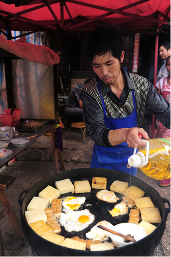 当天上午,在拍摄好平坝古镇之后,我们一行首先来到位于老街的马晓忠家,他家的房子虽然街面不宽,但是进深有30多米,全都堆放着加工用的工具,记者发现,慕名而来品尝小吃的人不少,还有些则是打包带走,主人正在忙着煎豌豆粉和臭豆腐,他家平均每天要各加工60斤左右的豌豆和50斤左右黄豆,到了冬腊月间,就要做得更多了。没有请小工,全靠夫妻两二及小女下班后来帮帮忙,打打下手。马晓忠说,制作过程非常辛苦,天不亮就开始,再加上做臭豆腐,基本一天中很少有闲着的。