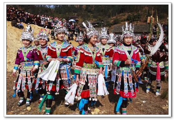 广西融水杆洞乡正月十二日,赶坡姑娘大都穿上美丽漂亮的百鸟衣盛装,因而取名为百鸟衣坡会。百鸟衣,顾名思义就是用百鸟的羽毛装饰而成。传统百鸟衣的主要材料有土黑亮布、土珍珠(一种树的坚果)、刺绣和白色鸟羽绒,经精心制作而成。作为百鸟衣发源地的杆洞乡至今还保留着三件年代久远的百鸟衣,其中罗氏家族留存的一件距今已200多年。1989年后,新款的百鸟衣很快在苗山各地流行起来。