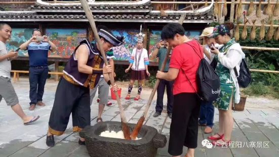 糍粑 ,侗族特色小吃,是以糯米为主料,浸泡后搁饭甑里蒸熟,再迅速放在石舀里舂至绵软柔韧,趁热将饭泥制作成可大可小的团状,搁芝麻炒香磨粉拌白砂糖(或是黄豆炒香磨粉拌白砂糖)的盘里滚动,即可取食。口感香甜。——平寨演艺中心