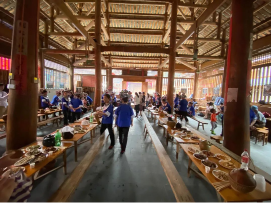 “百家宴”是侗族待客的最高礼仪。每逢村寨互访或有特别尊贵的客人来时,全村各户自备酒菜饭,一起到鼓楼坪“一”字型摆开长桌,客人可从第一桌吃到最后一桌,你来我往、觥筹交错、热闹非凡。据说在当地流传着这样一个说法:“吃百家饭、纳百家福、联百家心、驱百家邪、成百样事、享百年寿”——各寨