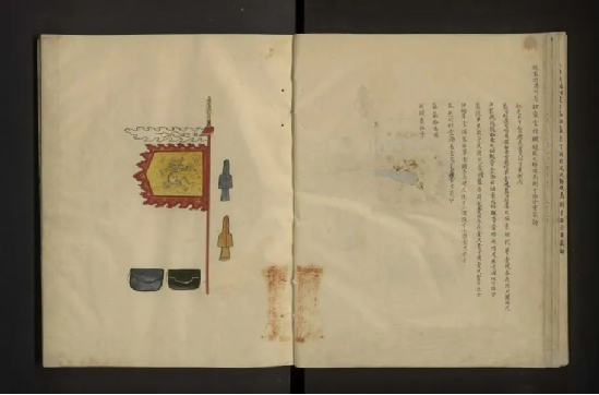 内蒙古自治区图书馆藏《满蒙八旗装备图》一卷,佚名撰,清彩绘本,一册。题名代拟。开本高三十七点六厘米,宽三十点六厘米,无界栏。全书现存七十三幅彩绘图,其中旗帜图三十九幅,盔甲、武器等图三十四幅。每图后注明该装备名称、数量、颜色、尺寸等信息,若干页图后说明文字缺失。书中钤满汉合璧印二十余枚,有绥远城八旗满洲协领图记八种,另有“绥远城左翼蒙古协领图记”“绥远城左司之关防”等印。