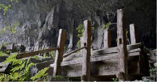 果里岩洞葬位于贵州龙里县摆省乡果里村东1公里煤洞坡的洞穴中,地处岩溶山原,峰丛林立,乔灌间杂。该洞在山顶下四十米处呈南北向横穿山体,长580米,宽为38—65米,高为21—50米,有两个入口;北面入口,宽54米,高21米,;南面入口,宽35米,高45米,有三道石砌墙垣。洞中地势内斜平缓,洞内干燥,能见度好,入口处地势外斜。据查,果里的苗族于明朝初期从贵阳迁徙而来。从迁徙之初至清末,他们均习惯将亡者殓于棺木集中存放在洞穴之内。在洞穴北面入口3000平方米的范围内现存完好的棺木有192具,腐朽散落及其它原因损毁的约200余具。棺木材质为杉木。棺木有平板平头和鼓型雄头之分,其大小因亡者的体型而定。平板平头型棺木制作粗糙,长1.45—2.23米,宽0.46—0.75米,高0.46——0.9米;鼓型雄头棺木多为杉木本色,长1.5—2.23米,宽0.48—0.8米,高0.5—0.9米。棺木一律头向北面入口,均固定于两个或三个“井”字架上;三个“井”字架表明亡者为男性,两个“井”字架的为女性。棺内亡者头靠凹型木枕。平板平头棺为明代,鼓型雄头棺为清代。