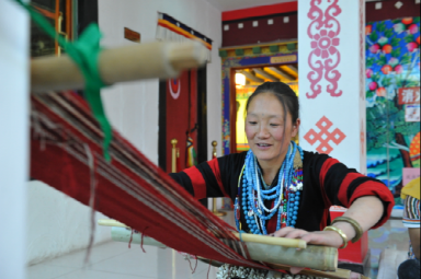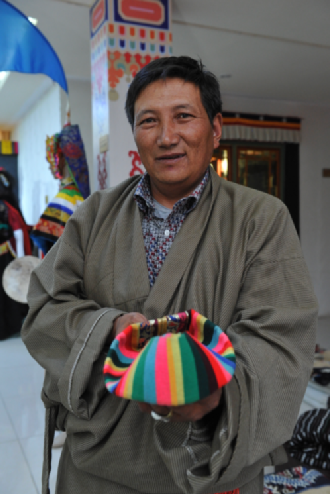 在自治区群艺馆的展出现场,除却这些光鲜亮丽的民族服装之外,另一个特殊群体也同样吸引了众人的目光,他们便是从西藏各个地区前来为观众展示藏装制作工艺的民间手工艺人。他们有的在织布,有的在裁剪,有的在穿针引线做靴子、缝制衣服,这些数以万计的、平凡而又伟大的民间手工艺人们,用他们几十年如一日的坚守,默默地承担着民族文化创新与传承的历史使命。