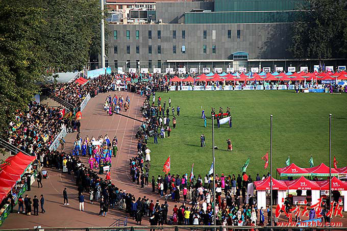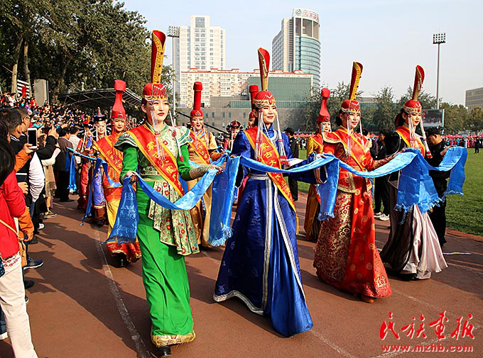 开幕式上,发起并组织“首届在京蒙古族那达慕大会”的原中央民族学院民语系77级蒙古语班方队通过主席台