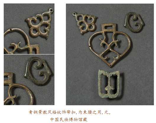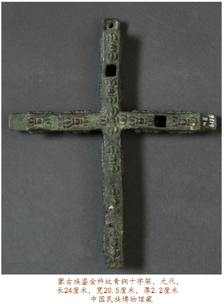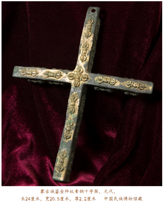 眼前此件在内蒙古达茂旗出土的元代鎏金青铜十字架,四面排列有浮雕金刚杵纹,其正面每个金刚杵图案上均有鎏金装饰,十字架上部穿孔则可用于悬挂。金刚杵是藏传佛教里的修行法器,象征力量与智慧;而十字架则是基督教文化的标志,如此混搭,历史便要传递出种种:在信仰藏传佛教的蒙古高原,金刚杵,象征无畏圆满,十字架,则代表救赎重生,东西方文化的结合亦呈现某种文明可能达到的无可比拟之高度。