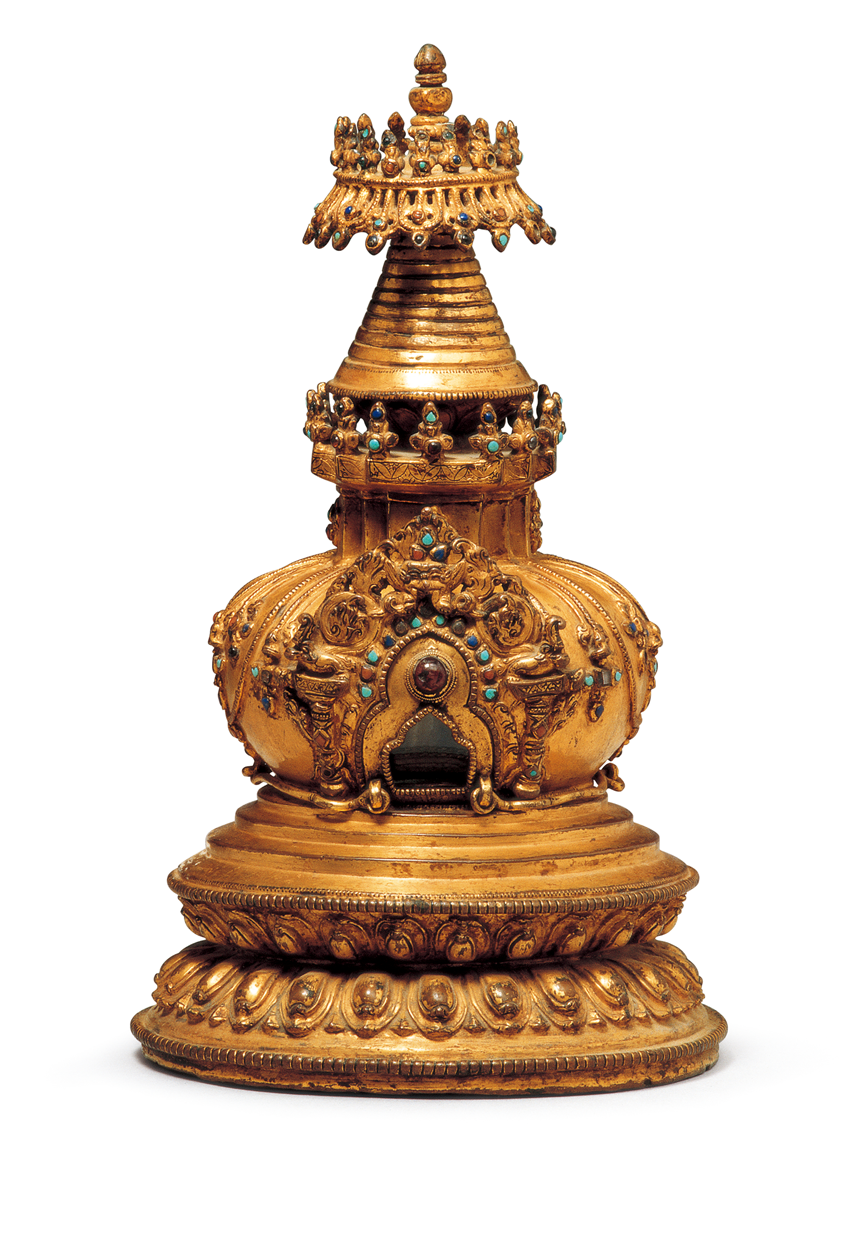 青海一些牧区,天葬日凌晨,死者最小的儿子将尸体抱出帐蓬,人们把已经捆好的尸体和一个装满土石的口袋连接起来搭在牛背上,或由天葬师背尸体到火葬场,送葬者不能回头、不能喧哗、不能停步。到天葬台后,除留一个非亲属的老人外,其余人全部撤离,然后天葬师将尸体肢解喂秃鹫。如果秃鹫将碎尸吃干净,意味着死者生前行善积德,其灵魂已升天,如果秃鹫没吃干净,说明死者生前有罪孽,家人要给寺院布施,请求寺院僧人再做法事,以赎死者罪恶,让灵魂早日升天(图为鎏金紫铜舍得塔)。