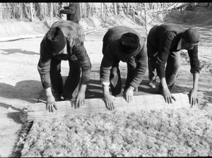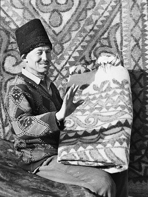 这时,亚生已经开始了第二步,他把弹好的羊毛铺匀,开始喷洒开水。只见他熟练地把水喷向羊毛,然后和妻子一起快速把帘子卷好,用羊毛绳绑紧,再用脚踏着卷好的帘子在平地上来回踏蹬,这样不停地重复后,做成了毡坯。亚生停下来解开帘子,拉平毡坯,修整好边角,又洒上热开水,把毡坯卷起,这是工艺最关键也是最后一步——他们一起跪在帘上,用双臂反复搓滚毡坯,感觉已经平整了,夫妇俩又齐心协力把毡坯展开拉平,放到院子里。此时,亚生长出了一口气,抹抹头上的汗说:“晾干了就可以卖了!”