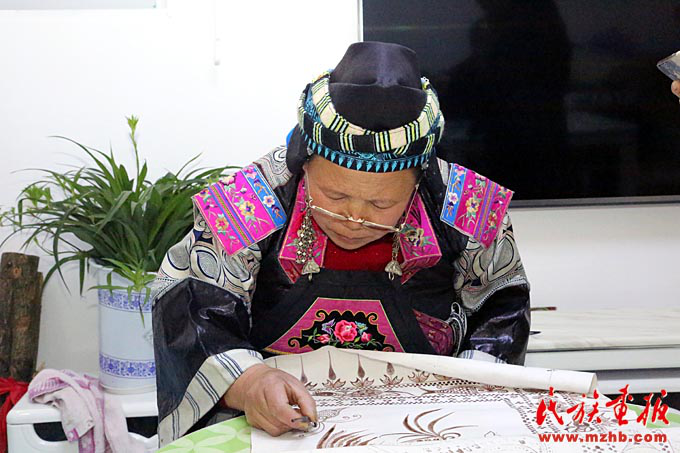 吴安丽向王阿板介绍新的蜡染图案