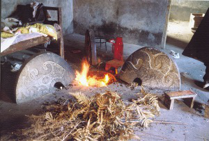 凉山彝族独特的“锅庄石” 。彝族的火塘为全家的生活中心,进食、取暖、照明、会客、议事等都围着火塘进行。“锅庄”由3块石头支撑,一般在房屋建成前就请石匠打造好锅庄石。其石料选取没有污垢而又无缺陷的青石,凿成厚10厘米左右的变异扇形,上面刻有龙、火、日、月、鱼、凤等古朴传神的浮雕图案。日常生活中,一般在锅庄“上方”(火塘里侧至墙壁)设矮床。