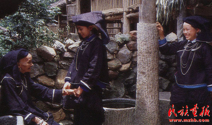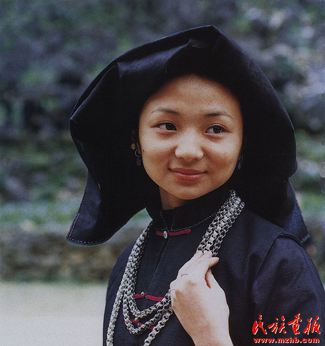 妇女的服饰更具特点,无论老少,都喜欢穿右盖大襟和葫芦状矮脚圆领的紧身短式上衣,下身以宽裤脚、大裤头的裤子相搭配,腰系黑布做成的大围裙,头带黑布大头巾。其围裙既宽且长,戴时能系周身有余,裙底垂挂到小腿下部,围裙不仅作为装饰,而且可以作为劳动工具,遇赶圩或走亲访友和劳动时,可将围裙底翻卷上来作成小包袱,用以包装和盛装物品。妇女头巾都是一块自己纺织染成的长条黑布,戴时先围绕在头上,然后翻折摆布成火棱形的图样,罩在整个头上,再把头巾的两端分别垂挂到双肩上,看上去朴素美观。同时还可以当做帽子遮荫用。她们的衣边、衣角、袖口、裙边和头巾的四边都用红布或黄布剪成小条以后镶捆上去,有的则用红、黄、蓝色丝线绣成波浪形的线条,使黑中衬出红、黄、蓝色的线条来,清雅明亮,色彩协调。再加上头发插着龙头形的银簪,颈项上带有银链或项圈,手带银圈、玉镯,耳挂珍珠耳环等,使人一看,黑中闪艳,朴素之中亦有玲珑之美,表现了她们独特的审美观。
