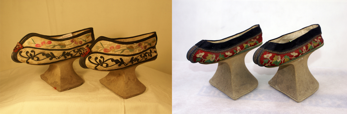 “旗鞋”款式独特,是一种高木底绣花鞋,又称“高底鞋”“花盆底鞋”“马蹄底鞋”等。其木底高跟一般高5-10厘米,最高可达25厘米。一般用白布包裹,然后镶在鞋底中间脚心部位。跟底形状通常有两种,一种上敞下敛,呈倒梯形花盆状。另一种是上细下宽、前平后圆,其外形及落地印痕皆似马蹄。“花盆底”和“马蹄底”鞋由此得名。除鞋帮上饰以蝉蝶等刺绣纹样或装饰片外,木跟不着地的部分也常用刺绣或串珠加以装饰。有的鞋尖还饰有丝线编织的穗子。这种鞋的高跟木底极为坚固。