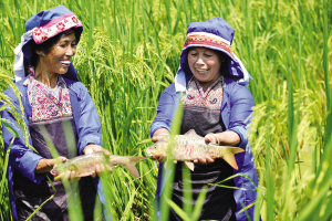 稻田养鱼是当地侗乡群众的传统习俗,烧鱼是侗族的一种传统美食。“烧鱼节”是当地侗族的一项传统民俗活动。在初秋时节,当地侗族群众开田放水,捉鱼,全寨男女老少,野外生起篝火烤鱼,用烧鱼、米酒等祭祀鱼神,祈祷鱼粮丰收。图为该寨的侗族群众在稻田捕鱼。