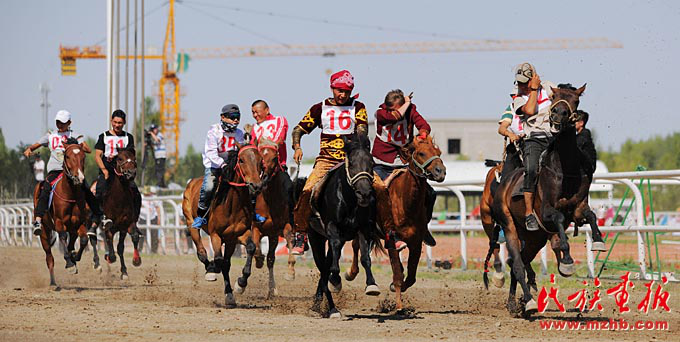 “叼羊”是哈萨克族一种力量和勇气较量的马背上的比赛。图为阿克塞县赛马会上的叼羊比赛