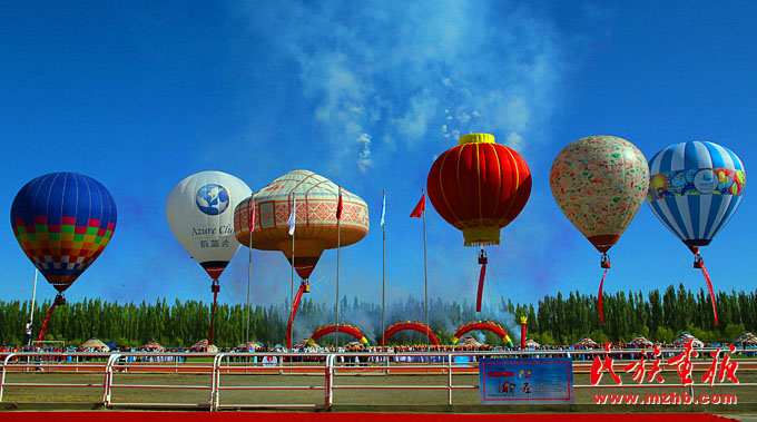 这6只热气球是甘肃省阿克塞哈萨克族自治县的旅游风景之一,其中毡房式(左三)热气球是阿克塞县的旅游空中形象大使