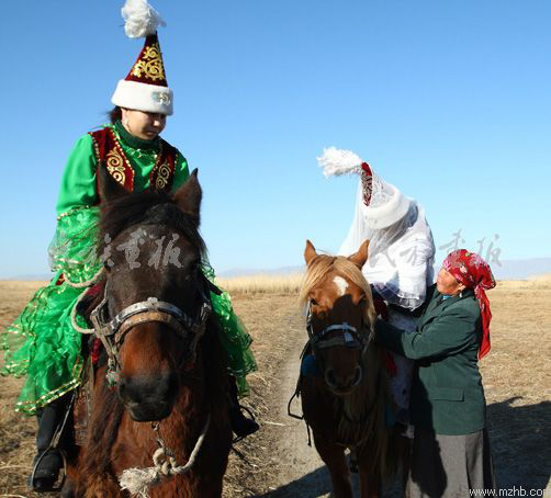 青年男子唱完,就用冬不拉琴把新娘的面纱挑开。新娘见过亲友,便被扶进新房。