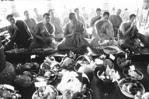早晨8点多钟,随着缅寺大佛爷都比罕念诵起那古老的滴水词经,赕奉仪式开始了。我随玉波一家坐在从家里带来的凉席上。缅寺里已摆放不下人们送来赕奉的物品,只好放在缅寺的周围。人们用一根白线拴系着物品连着缅寺,以示并没有远离缅寺和佛祖。