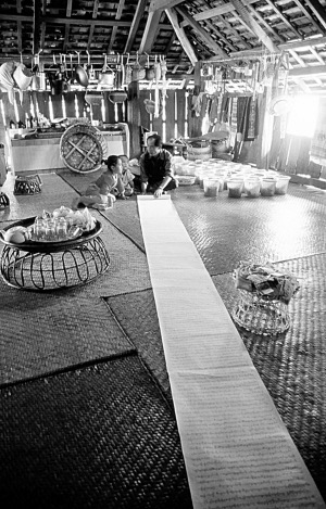 我问过玉金,给玉波筹办赕奉物品花了多少钱。玉金对我说:“花多少钱?不知道。我们从来不算,想花多少就花多少。算了不好!”不过我还是私下算了算,买的东西虽然多,但都是些价格不高的日用品。而请客却花了不少钱:与4户人家合伙买了一头2400元的水牛,470元买了两头猪,请了两天的客,远近的亲戚朋友都来了。这笔不少于5000元的花费对人均年收入只有2000多元的地区来说,算得上是一笔大花销了。