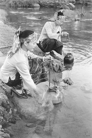 清晨,新娘、伴娘到河边挑水