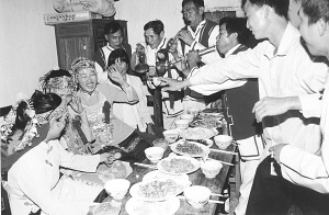 接着婚宴开始,八音队吹奏的乐曲优美动听,大家喝喜酒祝贺新郎、新娘;同时,男方家的带娘给女方家人开槟榔碗。开槟榔碗的顺序是女方家人由老到小分别接槟榔碗,意在感谢女方长辈、亲属对新娘的养育之恩。