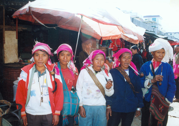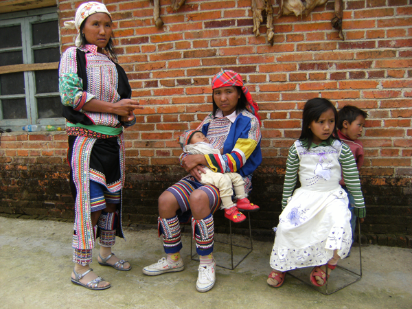 而妇女们的装束特点分明与众不同。最突出的是头戴宽约3公分左右的银箍,留长发;身着靛青色无领大襟右衽及横条花筒裙。腰系红布宽腰带和数十根细藤圈。耳挂垂肩圆形大耳环,颈戴银质大项圈,细项链。上了年纪的人,喜欢戴长约五公分伞状大耳筒,筒顶还刻有各种花纹。有的妇女在耳筒内插上香花香草,有的放上人民币,出门赶集,随用随取,很是便利(上下两图由刘军供图)。