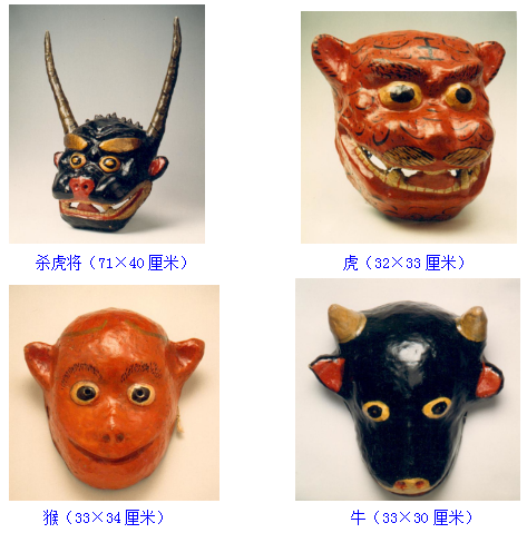 面具,土族语称“面古子”,是土族在表演某些仪式舞蹈时用以表现一定内涵的道具。按形制可分为假面和假头两大类。其中最具代表性的当属“纳顿”节日当中使用的面具。民族文化宫博物馆珍藏了三组土族“纳顿”面具,分别为表演“庄稼其”时的公公、婆婆、儿子、媳妇的假面面具;表演“杀虎将”时的杀虎将、虎、猴、牛的假面、假头面具;表演三国演义人物关羽、张飞、曹操、吕布的假面面具。面具材质均为布胎, 20世纪80年代征集于青海省海东市民和回族土族自治县。
