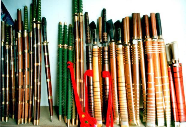 ★配刀把和刀鞘。刀把和刀鞘多用楠木加工而成,有的用铜、银皮包裹,上面雕刻装饰有各种花纹图案,如“猛虎长啸”“东山日出”“飞燕迎春”“十二属相”等,佩刀上还系有红缨背带,匕首的把多用牛角雕刻装饰而成。