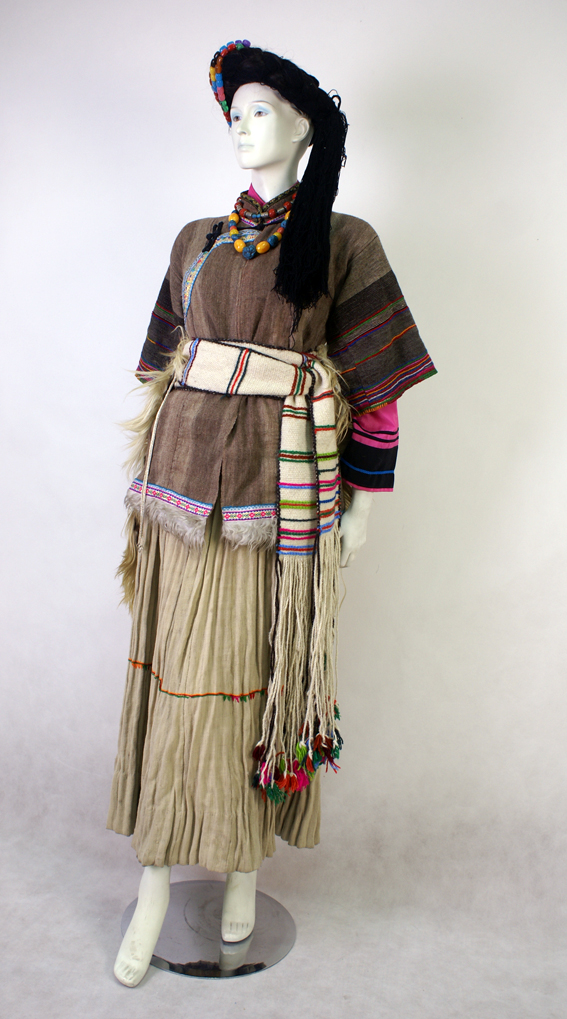 成年妇女都披皮披肩,通常是用山羊皮、绵羊皮、牦牛皮制成的,以山羊皮的为贵,披肩大多选用洁白的毛皮制成,美观大方。在披肩上结两根带子,系在胸前,白天可防寒,坐时当垫坐,睡时当褥子。兰坪、维西一带的妇女,则常常佩带色彩鲜艳的披肩,腰系叠缀花边的围腰布。普米族女子头饰分两种,未婚女子留长辫,用牦牛尾毛或丝线合拌搓辫成长发一根,先挽在头上,再将一串丝辫挽在黑发之上,并放一根红线,表示未婚。这种头饰简明美观,普米女子出外赶集,或走亲访友,均系此种头饰。另一种头饰则用一丈二尺长的黑布为料,做成头帽一圈圈缠上头上,为一般已婚或老年妇女的头饰。普米族妇女以佩戴耳环、头饰、手镯、胸链、彩带等饰物为美。这些装饰物大多用银子做成,富贵人家则用玛瑙、玉石装饰自己的妻子。有些地区的妇女要在头上插上獐牙,或一些银质小佛像等吉祥物,以求平安。