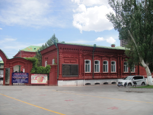 红楼,二十世纪初,俄国塔塔尔族商人建造的一座铁锈红色俄式建筑,绿色的屋顶与白木质的窗棂,形成强烈对比,欧式风情的浮雕装饰、高大气势的房屋,都显示着当年的豪华、气派和时尚。2006年国家列为重点文物保护单位,现在是塔城地区博物馆。