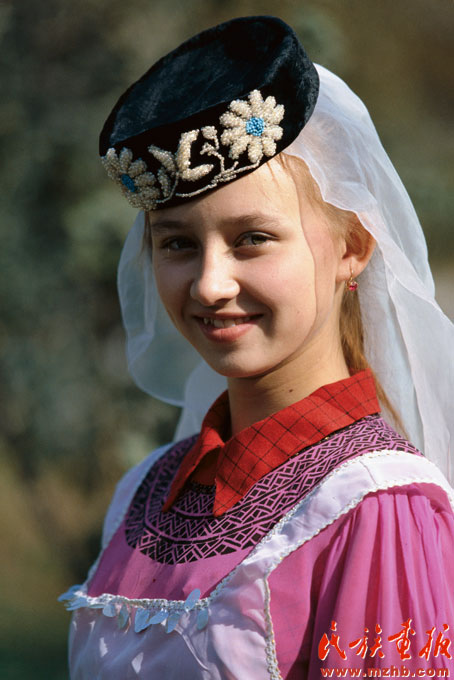 塔塔尔族的婚俗别具一格。按塔塔尔人的传统习惯,婚礼在新娘家举行,即先把新郎“嫁”出去,然后再“娶”回来。婚姻过程主要经历提亲、相亲、订婚、纳聘、嫁新郎、娶新娘六个过程(塔塔尔族少女。引自民族画报)。