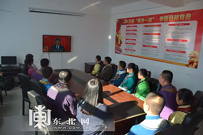 10月18日,同江市八岔赫哲族乡干部群众激动地收看党的十九大开幕会