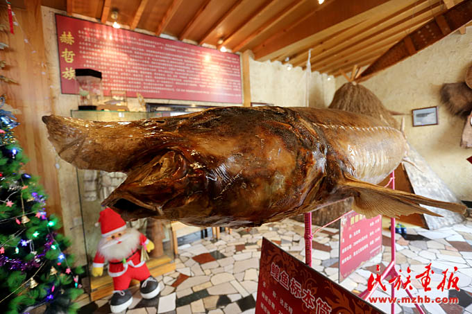 赫哲人把餐厅开到了京城,成为向外界展示赫哲族文化的窗口。图为赫哲族餐厅内57岁的大鳇鱼标本,体长2.5米,重达286斤(陈涛 摄影)