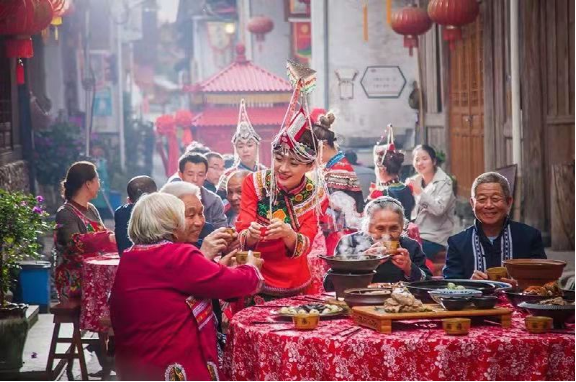 2.畲族婚嫁:婚礼的特色较多。迎亲队伍到村时,嫁方村上女性拿杉木枝栏路,表示晚上要对歌;到中堂时,嫁方请四位男子与迎亲队伍中四人相对作揖,此仪式叫“拾田螺”,表示欢迎;中餐由嫁方请迎亲队伍,媒人就坐中堂席首位,叫“落脚酒”;晚餐由娶方请嫁方亲戚朋友,舅公就坐首席,叫请“大酒”;午后,赤郎举行“借锅”仪式,赤郎端点红烛放有一刀肉和两块豆腐的米筛向灶神作揖后,用谜语念借所有的炊具,姑嫂们把能藏的炊具都藏起来,念不到就不拿出来,要全部重借,“借锅”意为娶方借嫁方炊具宴请客人。借好之后,赤郎要杀娶方家挑来的一只公鸡用以嫁方“请祖公”,杀鸡时,规定血不许滴到地上,滴一滴地上罚一碗酒;宴席中途嫁方女歌手会起歌头找赤郎对歌。畲族婚礼的又一个特点是,新娘夜行嫁,卯时进夫家门。行嫁时有牛在前头踏路,意为新娘一切都要新的,牛踏过的路为新路。以往嫁妆有锄头、斗笠、棕衣、线篓、火笼等,体现了畲族妇女热爱劳动。