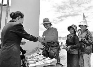 图为壤塘县瑟谷村农牧民们在蔬菜种植基地领取务工收入。