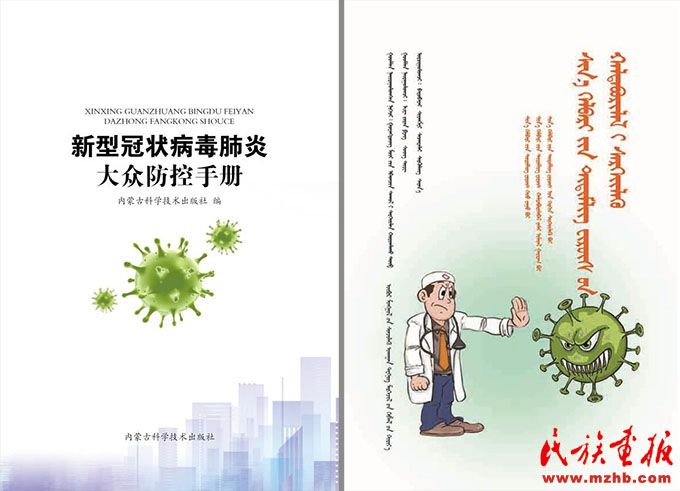 内蒙古科学技术出版社出版的《新型冠状病毒肺炎大众防控手册》(蒙古文版、电子版)。