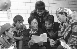 四川省西昌市大箐乡民主村彝族群众学习彝文版《十七大报告》。 资料图片