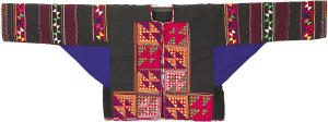 许多少数民族织绣作品都存在这种现象:刺绣纹样没有绣满,蜡染纹样没有画完。比如,其中一块贵州花溪苗族十字挑花绣片,它的上方露着一块没有任何纹样的黑底,用来给八角花纹样勾边的红、绿色线条,似乎也没有缝完。这样的“半成品”,是因为“年久失修”脱落了,还是“做到一半没线了”,亦或是“不拘小节”的风格表现?