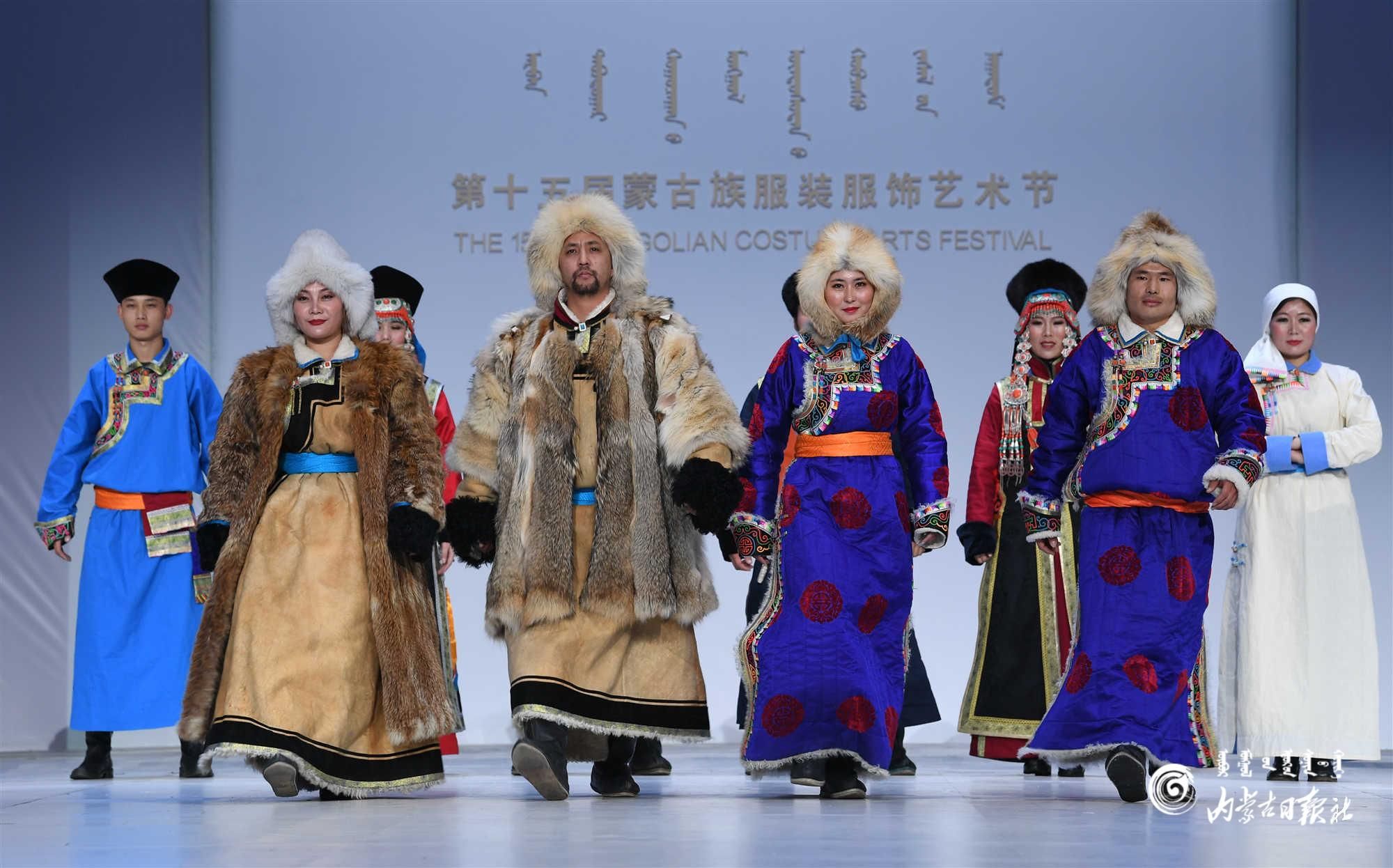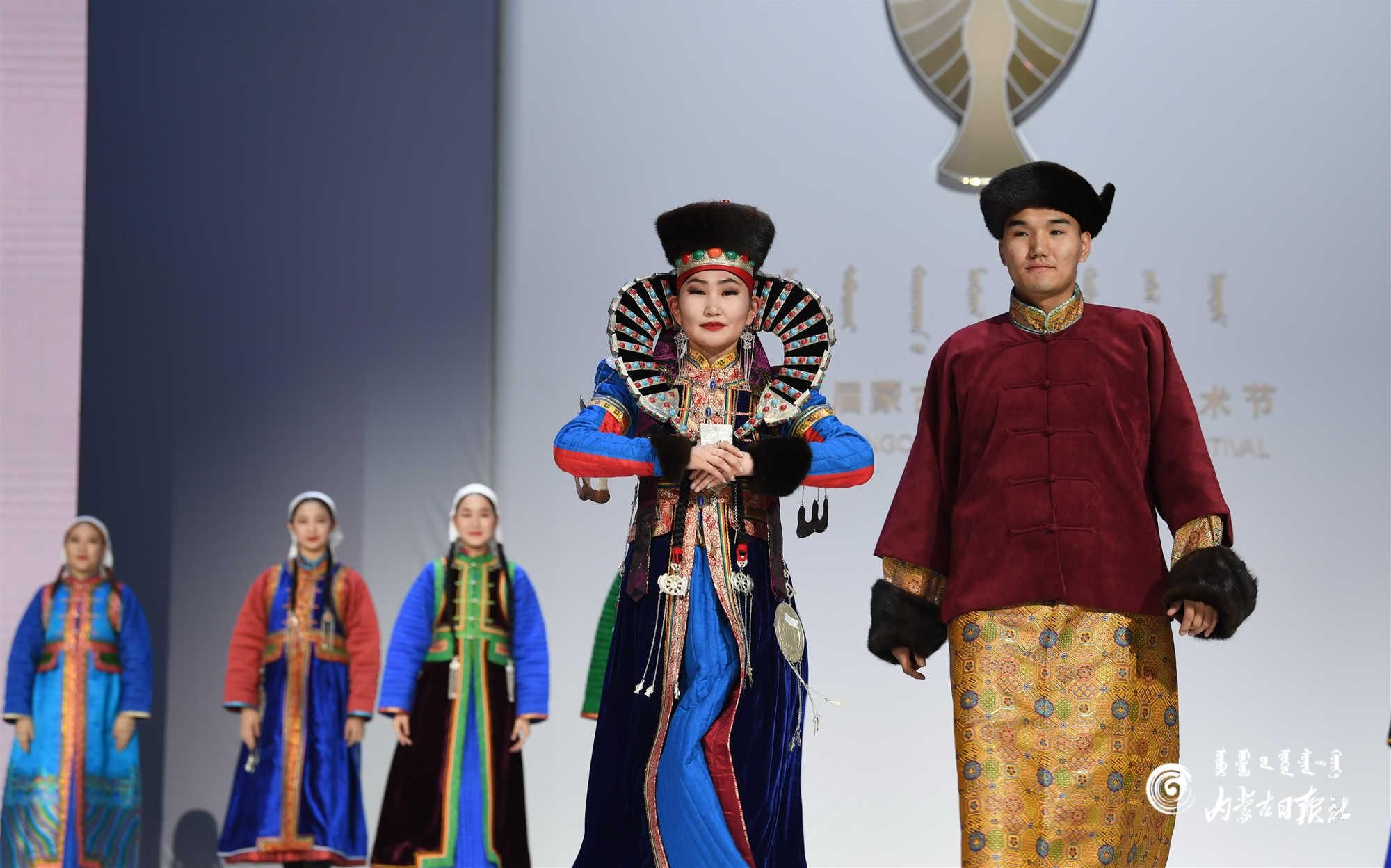 内蒙古艺术学院的学生在舞台上展示蒙古族礼服。