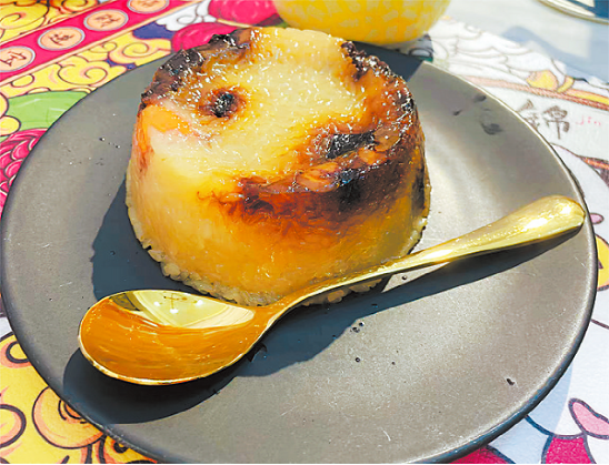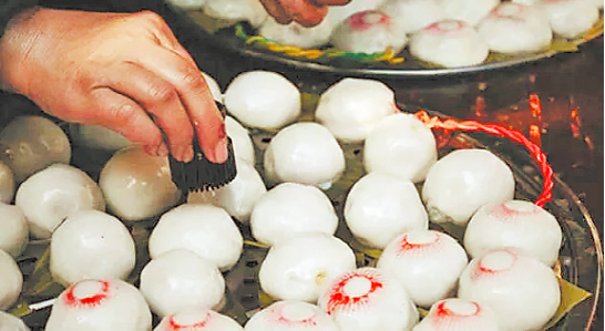 斋是将红糖味的熟糯米包入糯米浆制成的皮里,口感香糯有韧性。除了蒸熟后直接食用,斋还有一种特殊的吃法:将其对半切后,用油稍微煎过再加红糖水,煮成一碗甜香四溢的红糖斋。