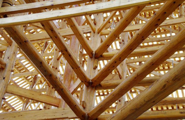 中国的木建筑构架一般包括柱、梁、枋、垫板、桁檩、斗拱、椽子、望板等基本构件。这些构件相互独立,需要用一定的方式连结起来才能组成房屋。在中国建筑中,原则上采取榫卯连接的方式,必要时也会用铁钉。