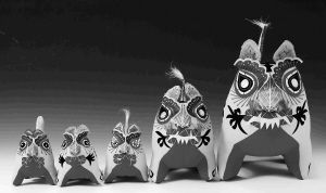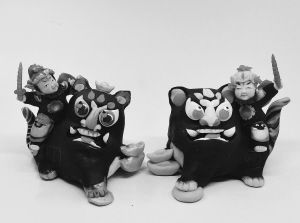泥叫虎是山东高密的一种民间泥塑,起源于明代万历初年,是形、色、声、动俱佳的民间工艺品,与扑灰年画、剪纸并称为“高密三绝”。泥叫虎腰部由牛皮连接,挤压其头部和尾部后,会发出响声,叫虎一名由此而来。河南也有叫虎,又称皮老虎。相较之下,山东的泥叫虎更具特色,而且在艺术风格上更大气,样式憨态可掬,哨子发出的声音也十分有趣。